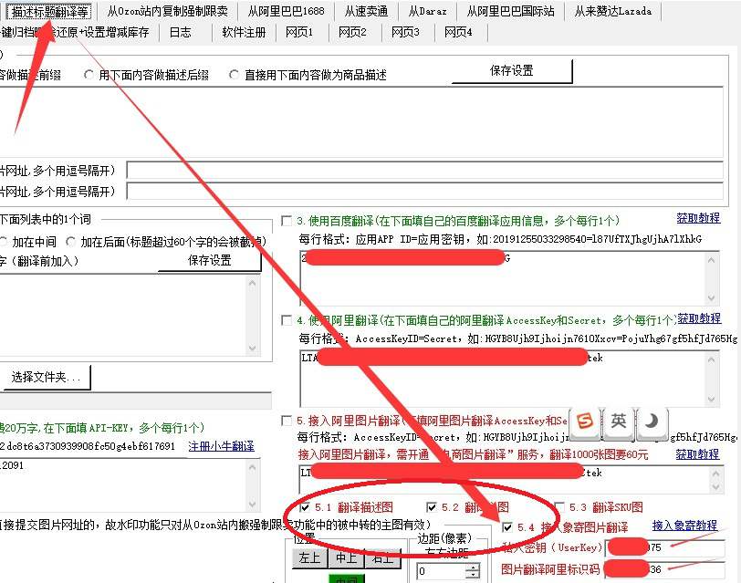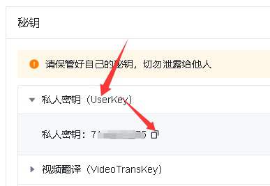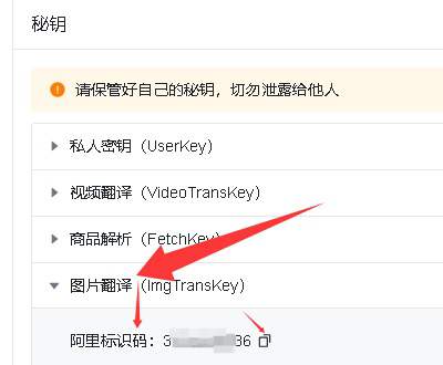 3、在这边秘钥下面点击“私人密钥(UserKey)”和“图片翻译(ImgTransKey)”,复制出里面的私人密钥和阿里标识码